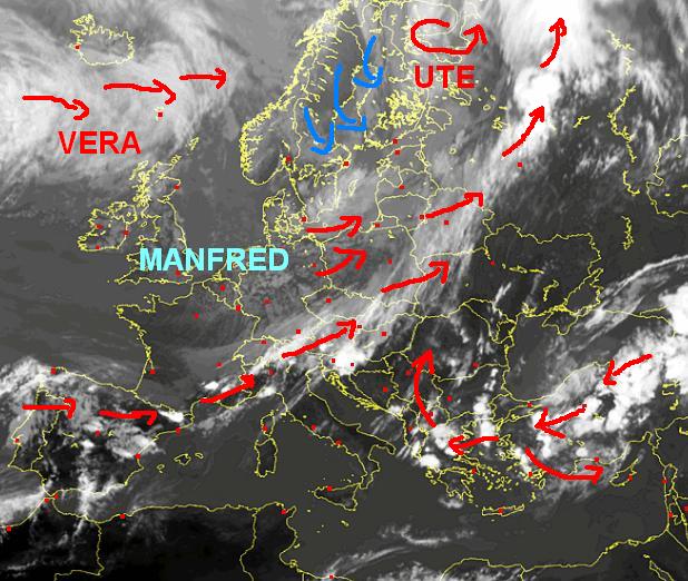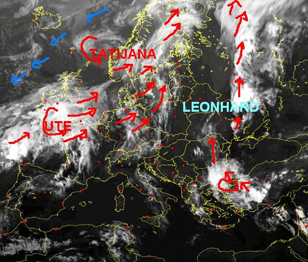 Sat24.com attēlos - virs pavadoņa iefiksētās mākoņu segas - ir ar manu roku pārzīmēts mākoņu kustības virziens, kas reizē norāda arī gaisa masu kustību. Sarkanās bultas - silts gaiss, gaiši zilās - vēss; tumši zilās - izteikts sals. Ciklonu centri apzīmēti ar riņķa veida bultām. Pie cikloniem un anticikloniem - ir Vācijas meteoinstitūta iedotie vārdi, kurus lieto visā Eiropā un aiz tās robežām.