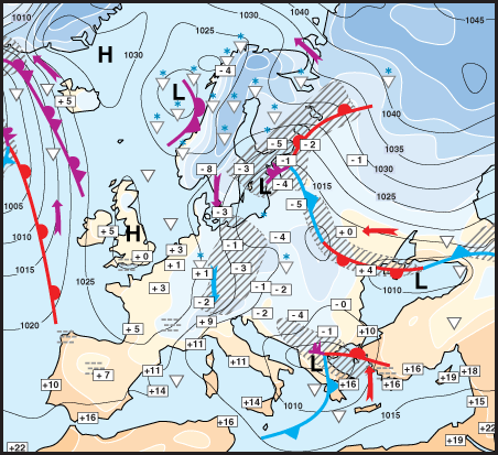 Ir liela gaisa spiediena starpība starp NICKI ciklonu R-Eiropā un THOMAS anticiklonu virs Krievijas R daļas. Mums tamdēļ ir spēcīgs vējš ar puteni, bet vakarā Kurzemē arī sniega nokrišņi.