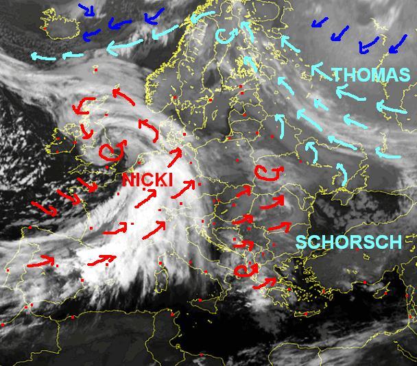 Sat24.com attēlos - virs pavadoņa iefiksētās mākoņu segas - ir ar manu roku pārzīmēts mākoņu kustības virziens, kas reizē norāda arī gaisa masu kustību. Sarkanās bultas - silts gaiss, gaiši zilās - vēss; tumši zilās - izteikts sals. Ciklonu centri apzīmēti ar riņķa veida bultām. Pie cikloniem un anticikloniem - ir Vācijas meteoinstitūta iedotie vārdi, kurus lieto visā Eiropā un aiz tās robežām.