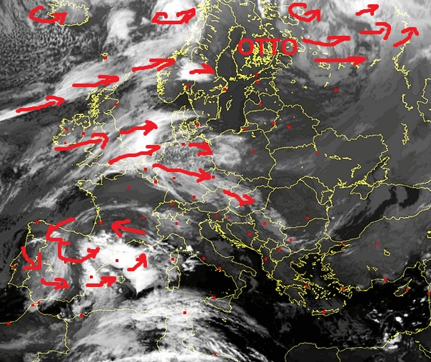 Sat24.com attēlos - virs pavadoņa iefiksētās mākoņu segas - ir ar manu roku pārzīmēts mākoņu kustības virziens, kas reizē norāda arī gaisa masu kustību. Sarkanās bultas - silts gaiss, gaiši zilās - vēss; tumši zilās - izteikts sals. Ciklonu centri apzīmēti ar riņķa veida bultām. Pie cikloniem un anticikloniem - ir Vācijas meteoinstitūta iedotie vārdi, kurus lieto visā Eiropā un aiz tās robežām.