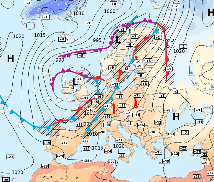 Esam uz A no frontes, tās siltajā pusē. Fronte tomēr nāk mums tuvāk, debesis virs Latvijas apmācas. Ir tāds pirmslietus stāvoklis. Vēl jo vairāk- neliels ciklons ir mūsu tuvumā, tas gan aiziet prom ZA virzienā. Latviju tā īsti neskarot. Pavisam nedaidz uzlīst vien Kurzemes Z daļā.