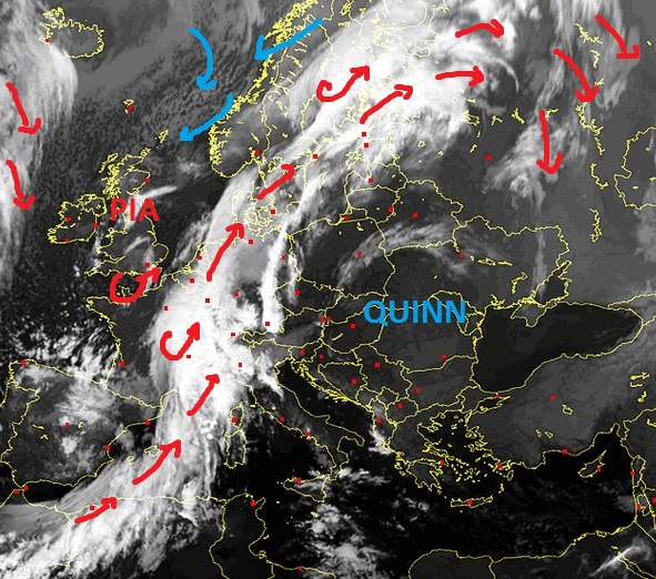 Sat24.com attēlos - virs pavadoņa iefiksētās mākoņu segas - ir ar manu roku pārzīmēts mākoņu kustības virziens, kas reizē norāda arī gaisa masu kustību. Sarkanās bultas - silts gaiss, gaiši zilās - vēss; tumši zilās - izteikts sals. Ciklonu centri apzīmēti ar riņķa veida bultām. Pie cikloniem un anticikloniem - ir Vācijas meteoinstitūta iedotie vārdi, kurus lieto visā Eiropā un aiz tās robežām.