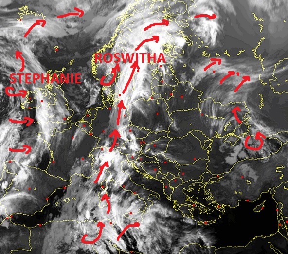 Sat24.com attēlos - virs pavadoņa iefiksētās mākoņu segas - ir ar manu roku pārzīmēts mākoņu kustības virziens, kas reizē norāda arī gaisa masu kustību. Sarkanās bultas - silts gaiss, gaiši zilās - vēss; tumši zilās - izteikts sals. Ciklonu centri apzīmēti ar riņķa veida bultām. Pie cikloniem un anticikloniem - ir Vācijas meteoinstitūta iedotie vārdi, kurus lieto visā Eiropā un aiz tās robežām.
