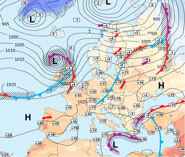 Sat24.com attēlos - virs pavadoņa iefiksētās mākoņu segas - ir ar manu roku pārzīmēts mākoņu kustības virziens, kas reizē norāda arī gaisa masu kustību. Sarkanās bultas - silts gaiss, gaiši zilās - vēss; tumši zilās - izteikts sals. Ciklonu centri apzīmēti ar riņķa veida bultām. Pie cikloniem un anticikloniem - ir Vācijas meteoinstitūta iedotie vārdi, kurus lieto visā Eiropā un aiz tās robežām.