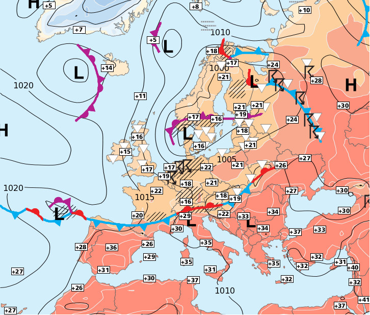 Esam ciklona A nomalē. Ir mākoņainība visā Latvijā, bet pievakarē un vakarā no D puses daļā Latvijas atnāca lietusgāzes ar nelieliem negaisiem, kas izsīka turpat pie D robežas.