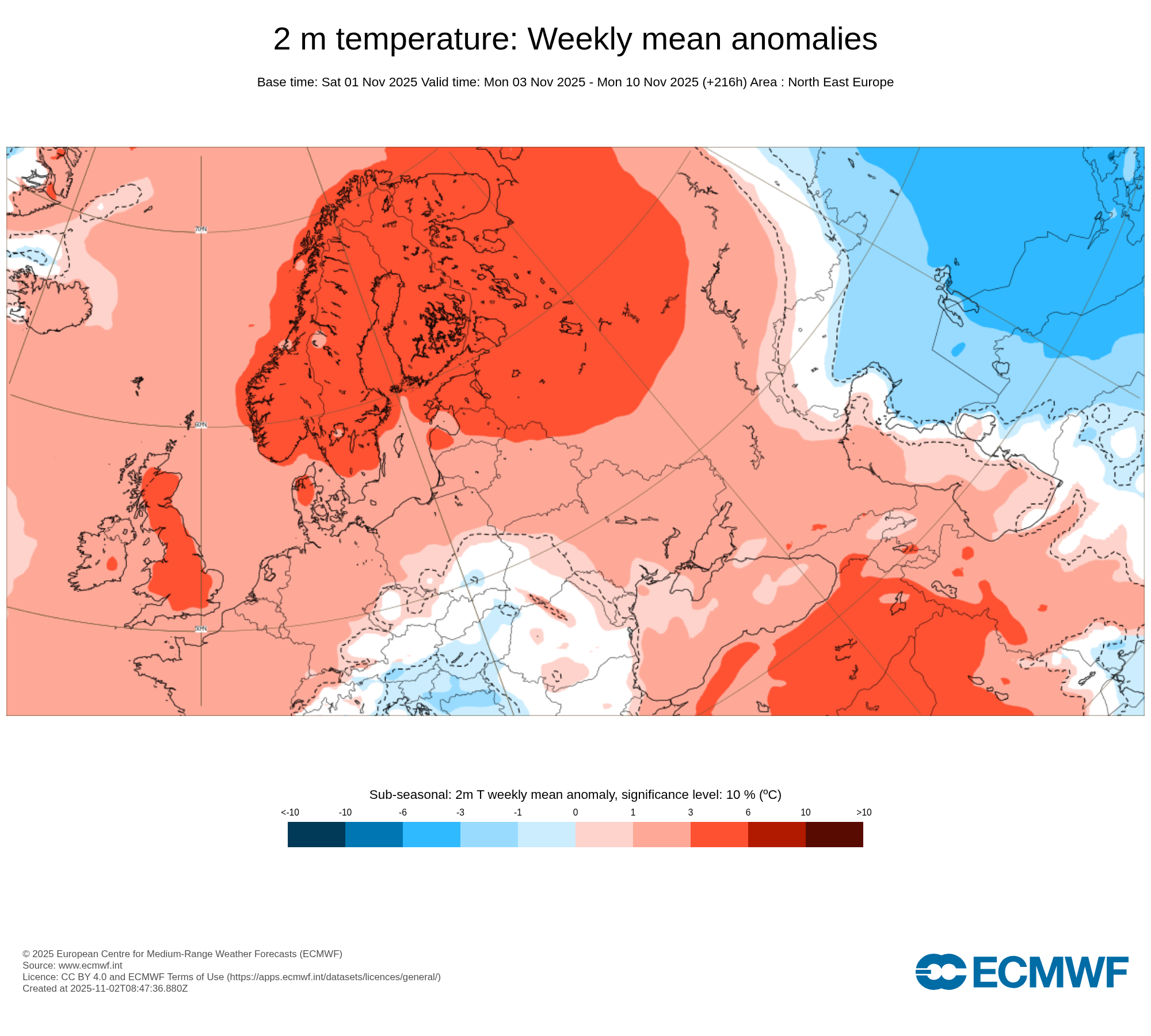 Tālākās prognozes šobrīd paredz, ka novembra otrajā dekādē vismaz uz kādu brīdi no ziemeļiem ieplūdīs vēsāks līdz auksts gaiss, bet arī tad Eiropas vidēja termiņa prognožu centra modelis vidējo gaisa temperatūru joprojām paredz virs klimatiskās normas.