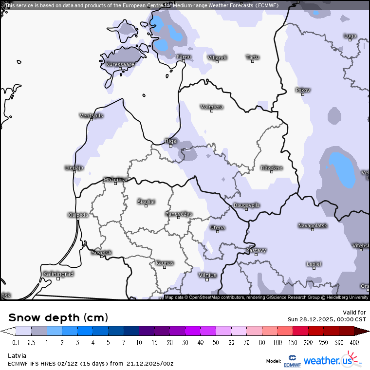 ECMWF prognozētā sniega sega naktī uz 28.12. (weather.us)