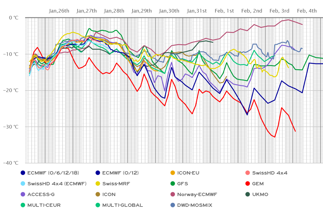 Jau piektdienas rītā vietām gaisa temperatūra no jauna var pazemināties zem -22 ... -20 C atzīmes, savukārt brīvdienās jau valsts lielākajā daļā tiek prognozēti -24 ... -20 C, vietām pat līdz -28 C. Attiecīgi arī dienas būs aukstas, gaisa temperatūra visbiežāk variē starp -18 ... -8 C. Tās gan ir pašreizējās prognozes un grafiks zemāk parāda, cik dažādas ir klimatisko modeļu interpretācijas. Jebkurā gadījumā - kādu laiku nepiedzīvota ziema turpinās!