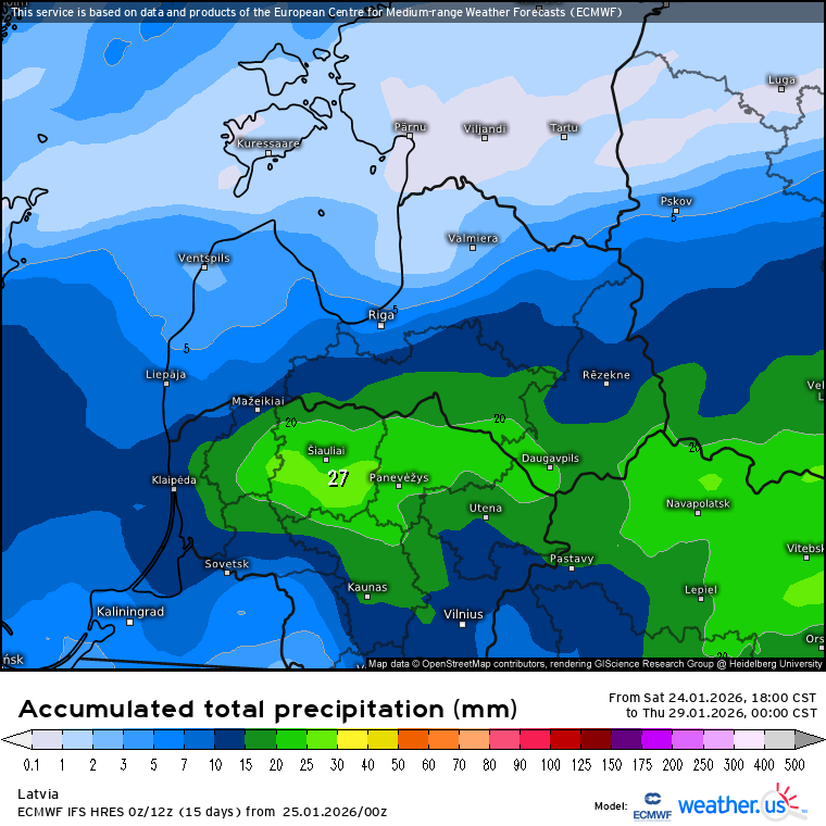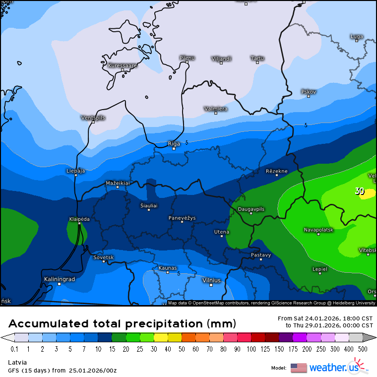 Kopējais nokrišņu daudzums līdz trešdienai ieskaitot (weather.us)