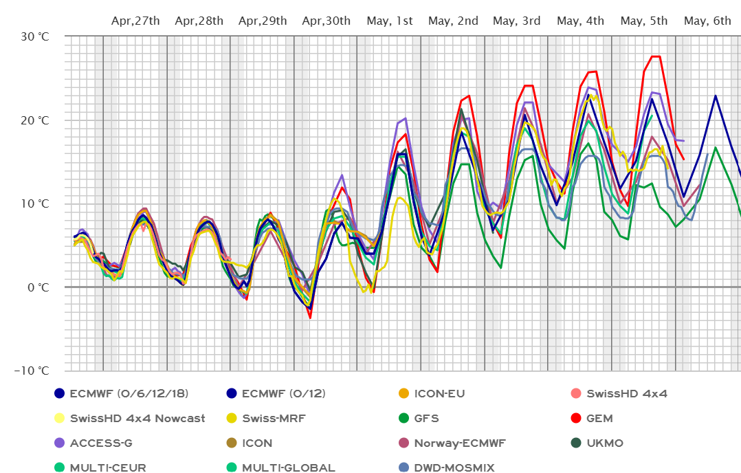 Lai gan vēl nav viennozīmīgi prognozējams, kur anticiklons atradīsies nedēļas nogalē, no piektdienas visdrīzāk gaidāms drīzāk sauss un bieži saulains laiks. Ar maiju mūsu reģionā jau būs ienākusi siltāka gaisa masa, gaisa temperatūra prognozēta starp +5 ... +18 C. Lai gan siltākie scenāriji paredz vasarīgu temperatūru ap +20 ... +24 C, jāatceras, ka tā ir tikai viena no iespējām un šādos, mainīgos laika apstākļos ilgtermiņa prognozes nav uztveramas nopietni, taču tendences ir gana skaidras.